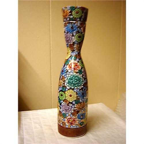 This Kutani decanter is just unbelievable. The artwork is so intense. There are all different colored flowers so intricately painted all over this piece. In between all of the flowers, the backround is gold.