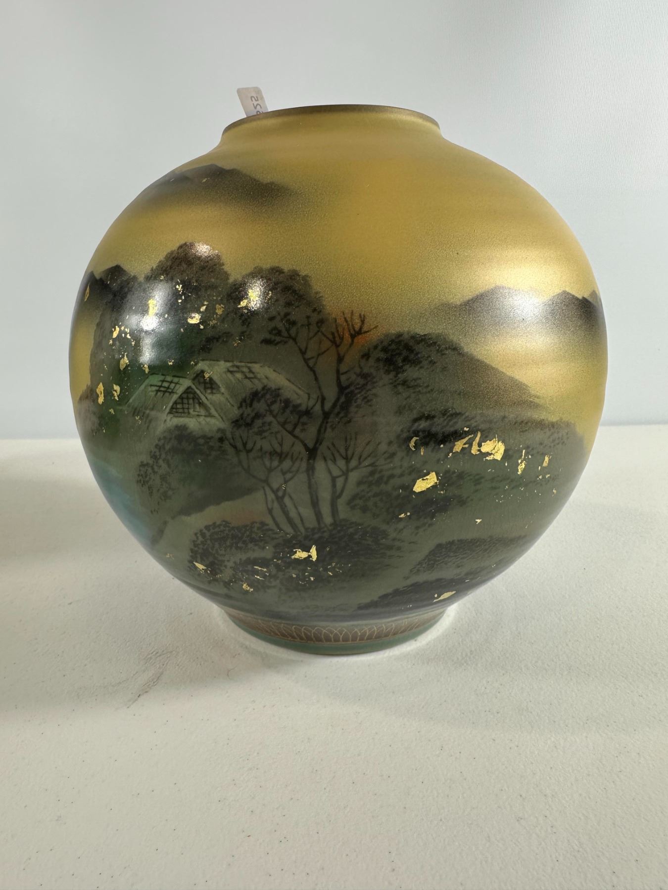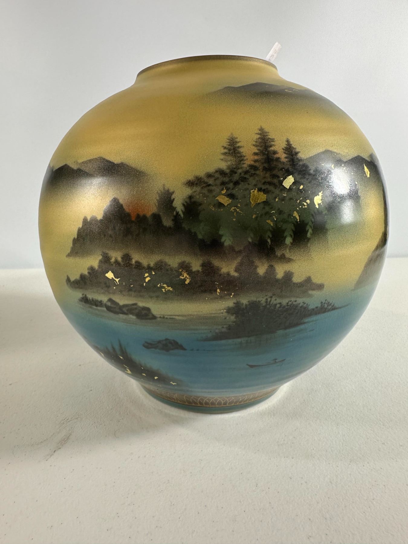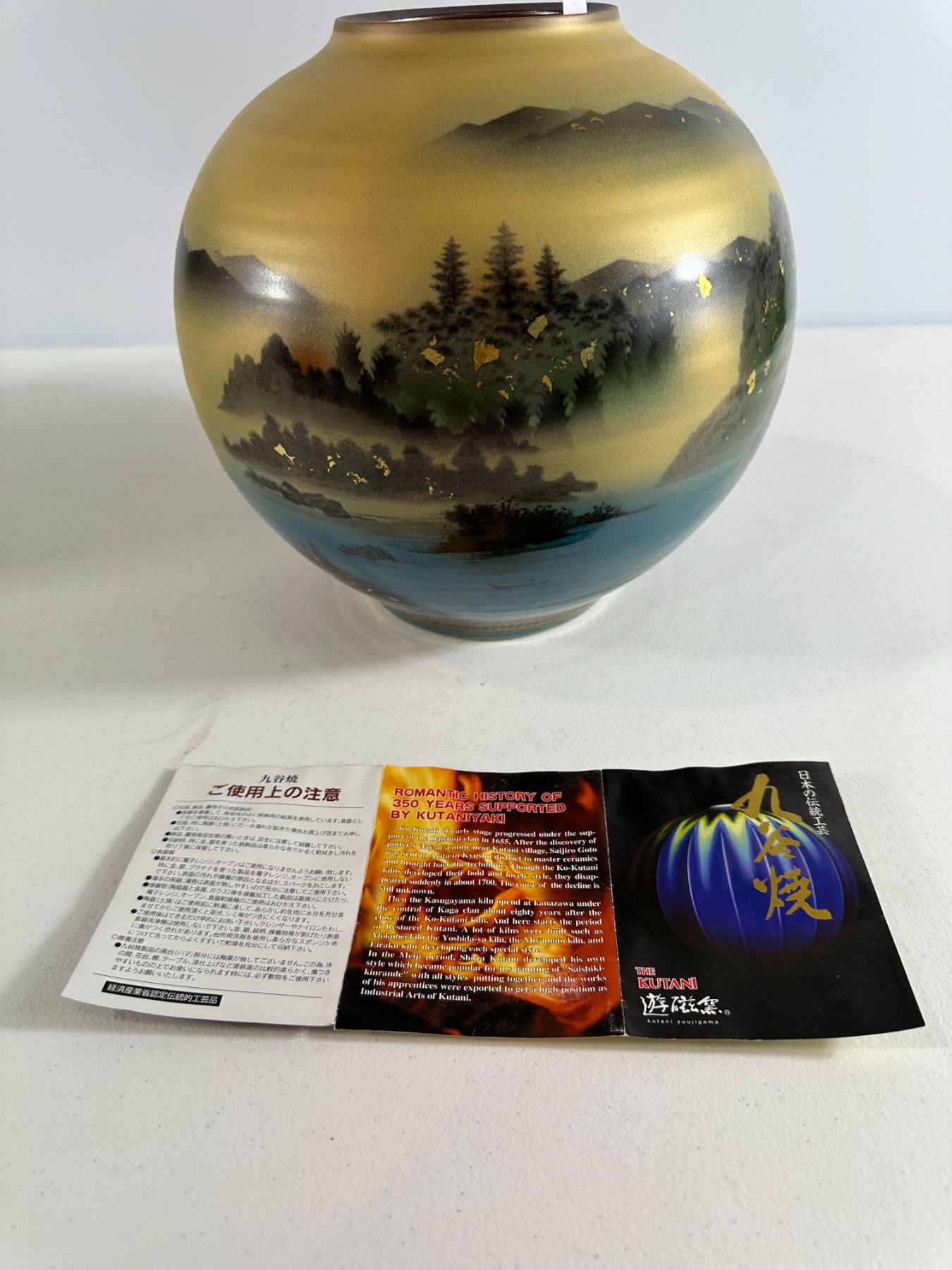 Modern Kutani art vase with misty mountains, pines, and lakeside scene highlighted by gold flecks; original leaflet included. Excellent condition.