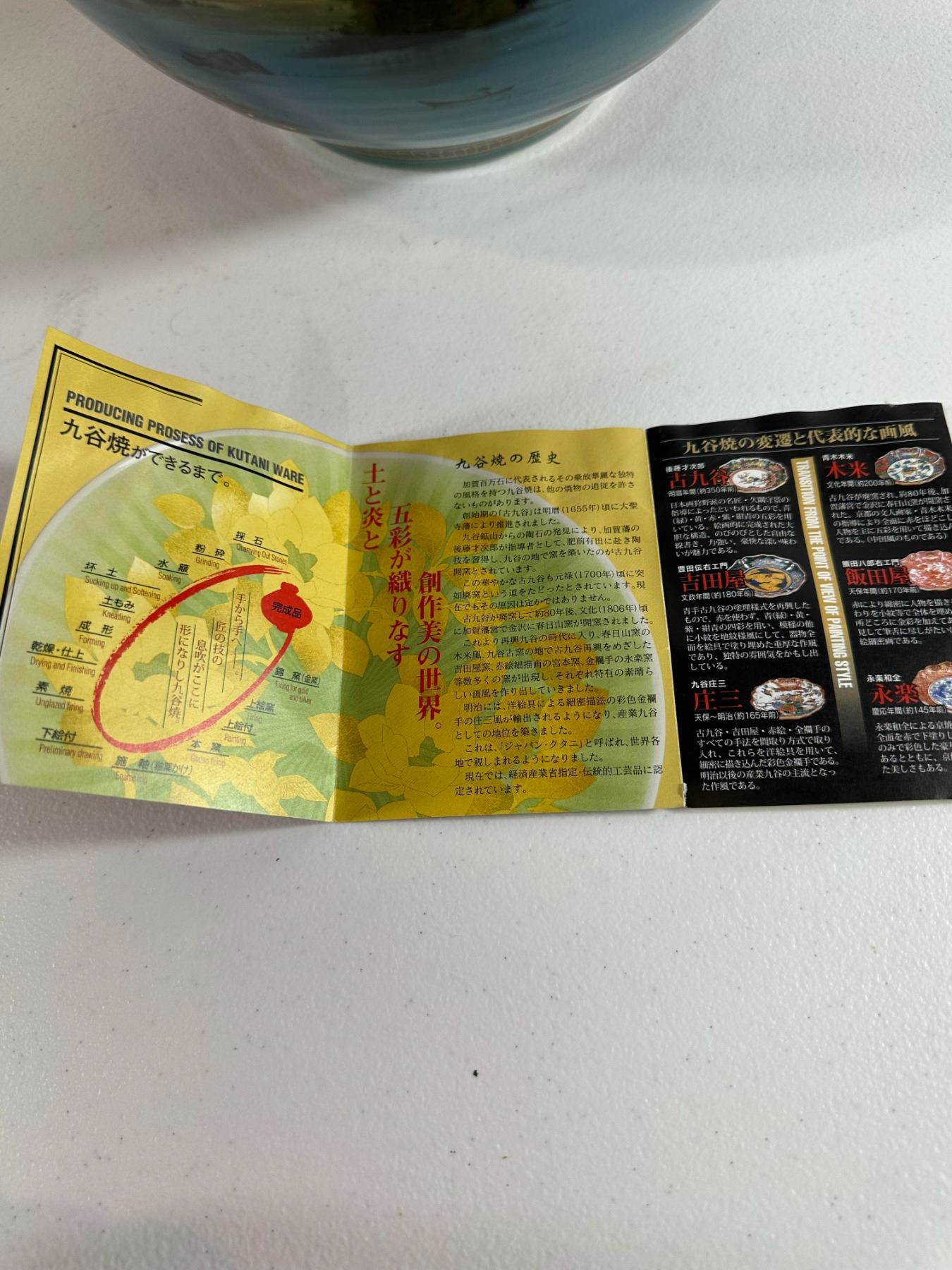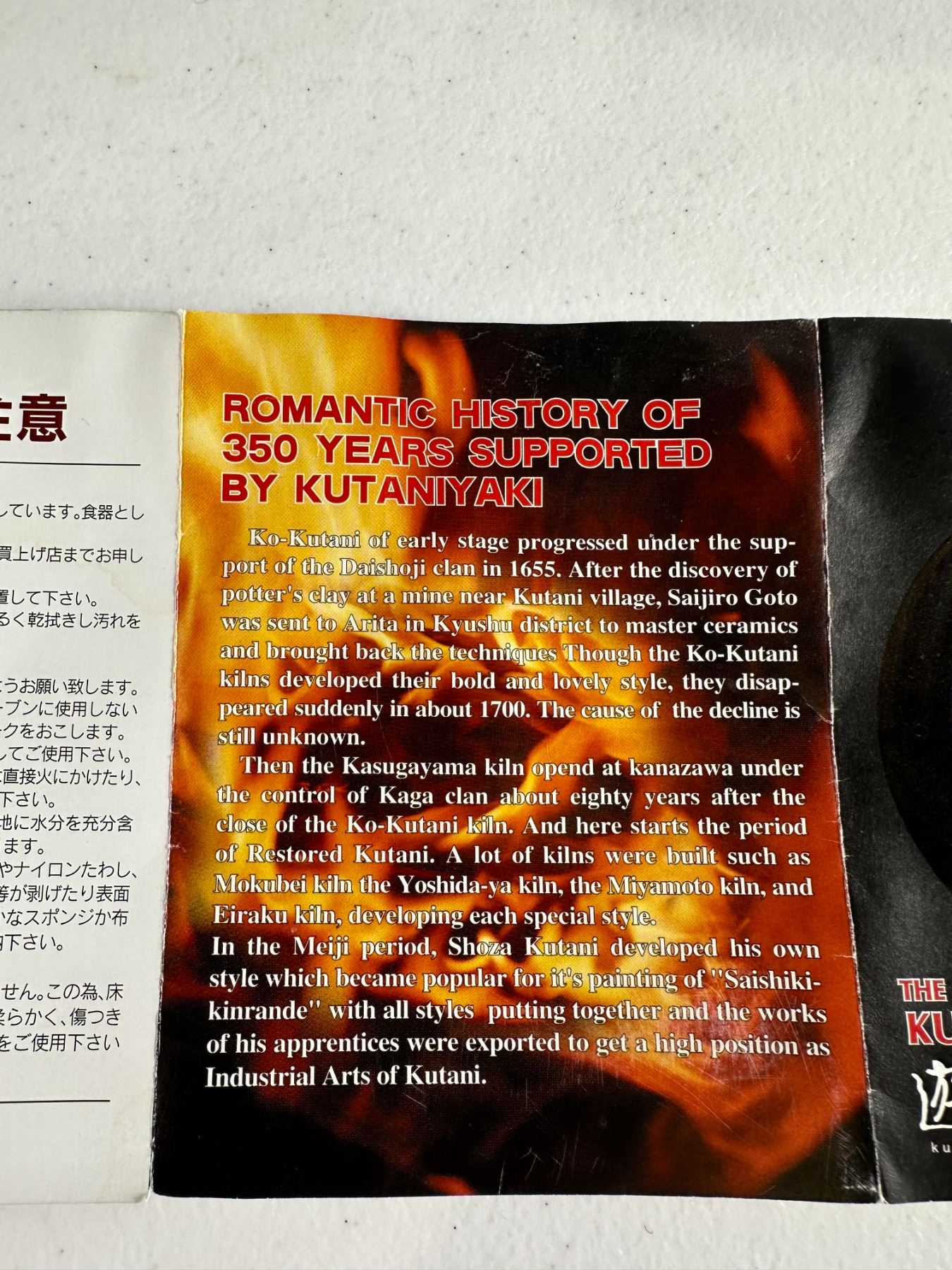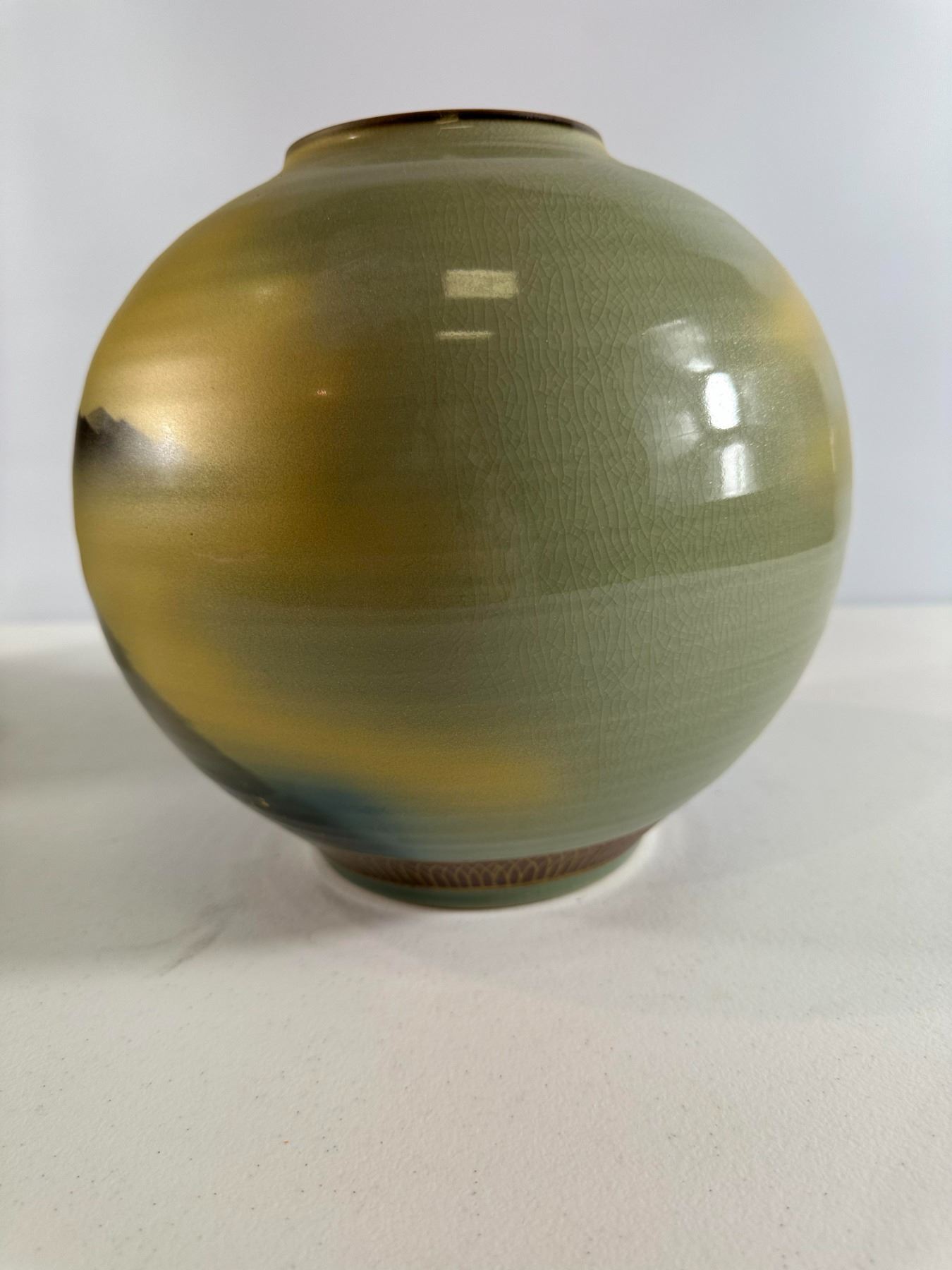 Modern Kutani art vase with misty mountains, pines, and lakeside scene highlighted by gold flecks; original leaflet included. Excellent condition.