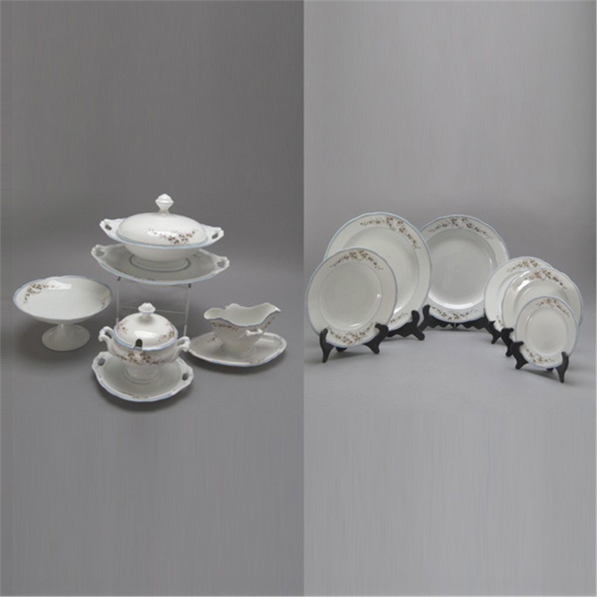 Russian Porcelain Partial Dinner Service, M.S.Kuznetsov Porcelain, Dmitrovsky Factory, Early 20th Century, each piece decorated with twin assymetrical floral bouquets in pale pink, white and green, molded with a scalloped edge with blue banded border with red outline; comprising: thirty-two dinner plates (9 1/2 inches); eleven lunch plates (8 1/2 inches); twelve soup bowls (9 1/2 inches); sixteen bread plates; two oval vegetable dishes (length 11 inches); two round platters (diameters 13 1/4, 14 inches); a covered casserole and undertray (height 8 1/2 inches); a covered sauce tureen (height 8 inches); a tazza (height 4 7/8 inches); two oval platters (16 1/2 & 17 1/2 inches); a gravy; and a serving dish (length 12 1/2 inches) (83); blue overglaze Kuznetsov D.F. Russian Imperial eagle mark, underglaze impressed initials HR in circle and numbers 16 or 33, numbers written in black 397.2, 377.12 or 397.3 [Some of the dishes have wear (small knife marks) from use. Seven of the dinner plates and the round tureen have small areas where the glaze has worn off and new glaze has possibly been reapplied. Three dinner plates, two bowls, and two bread plates have worn patterns from use. Three dinner plates have small rim chips, one with chip under rim, and one has two hairline cracks at rim. Three lunch plates have small rim chip; two bread plates with rim chips (one large and with an additional chip at base rim). The round tureen lid finial has been reglued; and there is a repaired chip under the rim of the lid on the sauce boat. Three or four pieces have a tiny brown firing frit spot.]