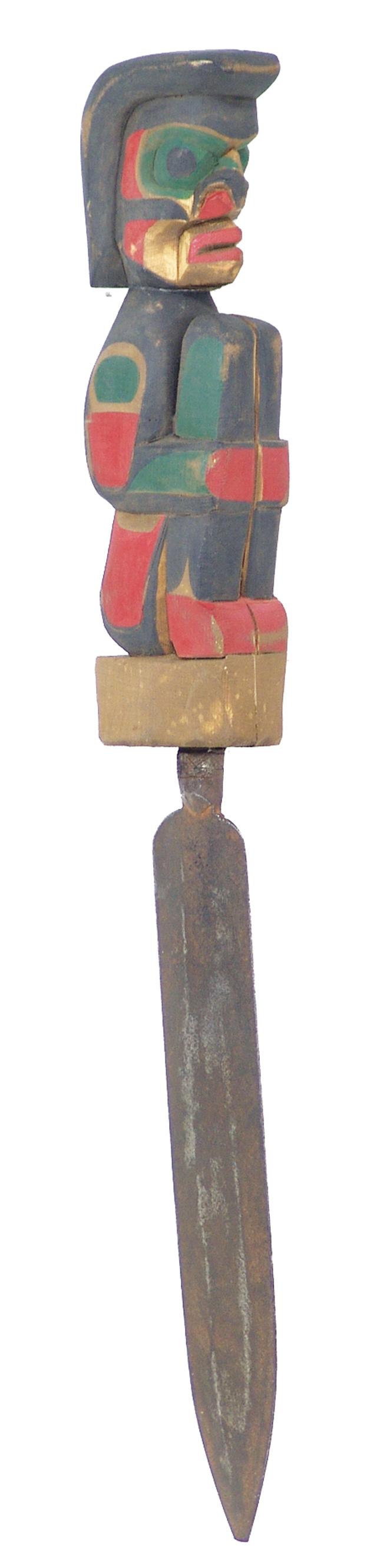 Late 1900s, Native hand carved & painted fighting knife with hand wrought iron blade - Alert Bay, British Columbia. 17-1/2"