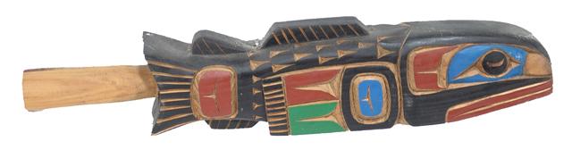 Late 1900s, Native hand carved & painted cedar salmon rattle - Alert Bay, British Columbia. 18"