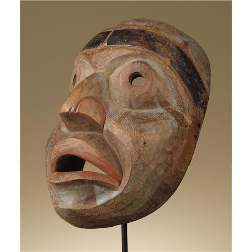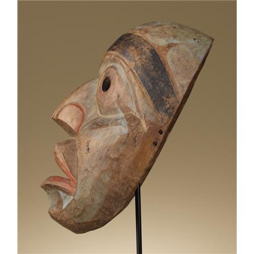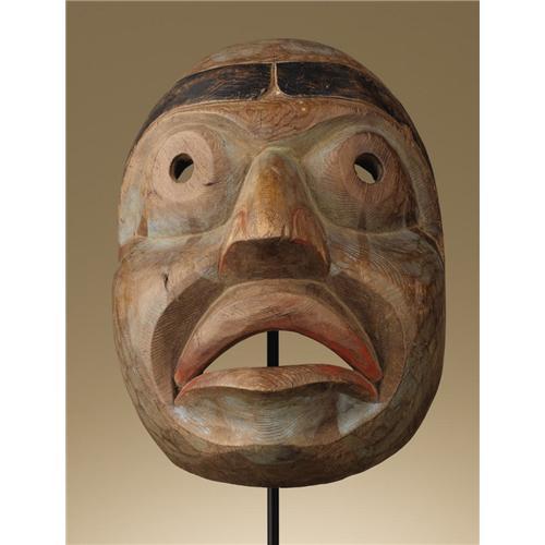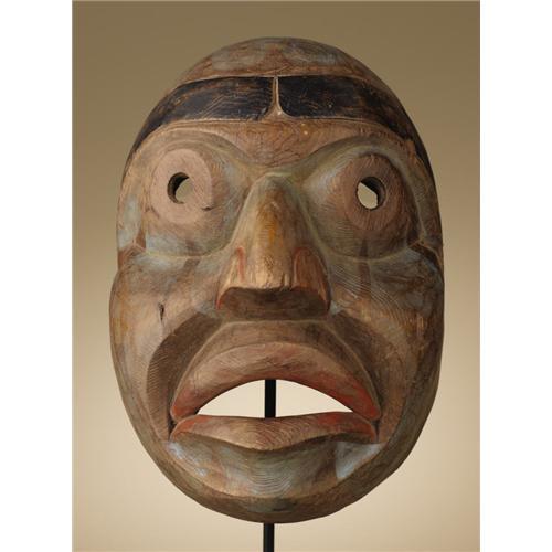<B>Kwakiutl Shamans Mask</B></I><BR>Circa 1970<BR>Height 10 3/4 in. Width 6 3/4 in.<BR><BR>This carved and painted cedar wood mask has human features but its significance is not known. "Of all Northwest Coast artistic creations, masks have the greatest sculptural variety. They were worn at such social ceremonies as feasts and potlatches, at winter initiation ceremonies, and during magic and curing rituals performed by shamans. Often the exact significance of a mask has been lost because such information was only known by those who owned and used them." This mask is attributed to Lelooska.<BR>Lelooska, aka Don Smith (1933-1996), was well known in the Pacific Northwest. He was of mixed-blood Cherokee heritage and adopted as an adult by the prestigious Kwakiutl Sewid clan. He emerged in the late 1950s as one of a handful of artists who proved critical in the renaissance of Northwest Coast Indian art.<BR><BR>Reference<BR>Wardwell, Allen. <I>Objects of Bright Pride.</B></I> Seattle: University of Washington Press, 1988, p. 38.<BR><BR> <BR><BR><B>Important