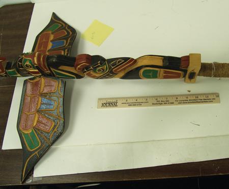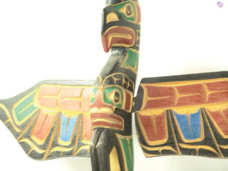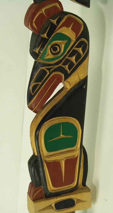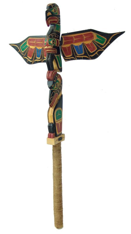 Circa 1980s, Rare elaborately hand carved and painted speakers staff with both eagle and raven figures, the eagle with outstretched wings. Very good condition. 37" From the Burks Collection.