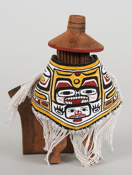 Kwakwaka'wakw Carved Chief with Chilkat, Hat and Copper Signed Aubrey Johnson 4" H. Good Condition