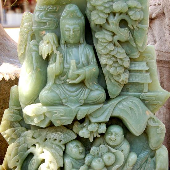 Gorgeous 318;000 carat solid Green Jade Kwan Yin scene carving; measuring 31" x 25" x 6". Unique; one of a kind piece. Hand carved with enormous detail showing Quan Yin in forest/moutain scene. Do not miss this rare opportunity to acquire an art piece that you will see only once in a lifetime!