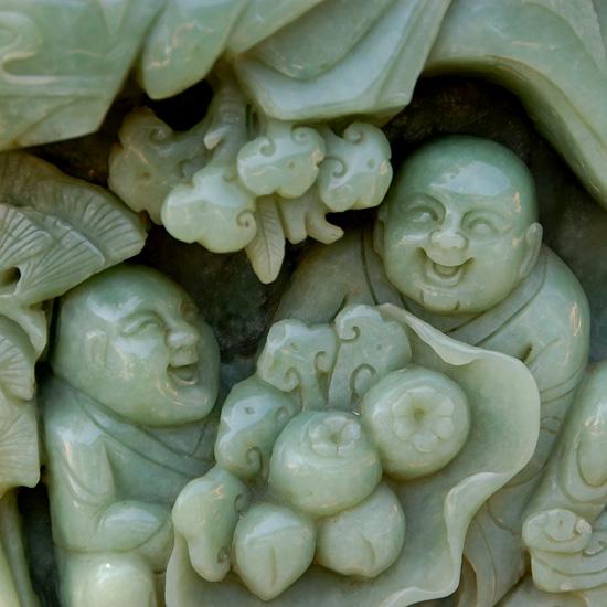Gorgeous 318;000 carat solid Green Jade Kwan Yin scene carving; measuring 31" x 25" x 6". Unique; one of a kind piece. Hand carved with enormous detail showing Quan Yin in forest/moutain scene. Do not miss this rare opportunity to acquire an art piece that you will see only once in a lifetime!