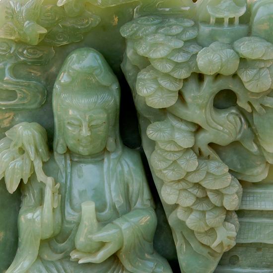 Gorgeous 318;000 carat solid Green Jade Kwan Yin scene carving; measuring 31" x 25" x 6". Unique; one of a kind piece. Hand carved with enormous detail showing Quan Yin in forest/moutain scene. Do not miss this rare opportunity to acquire an art piece that you will see only once in a lifetime!
