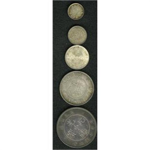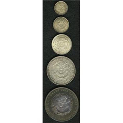 <B>Kwang-tung 5 piece set ND (1890-1908) including:,</B></I> 5 Cents, KM-Y199, nicely toned UNC; 10 Cents, KM-Y200, nicely toned UNC; 20 Cents, KM-Y201, lightly toned, Choice UNC; Specimen strike 50 Cents, KM-Y202, prooflike UNC with grayish-gold toning and minor hairlines; and a Specimen strike Dollar, KM-Y203, Choice, prooflike UNC with superb purple and blue toning. The Specimen strikes are rare and very popular<BR><BR><b>Shipping:</b> Coin/Currency (<a target="_blank" href="http://www.heritageauctions.com/common/shipping.php">view shipping information</a>)