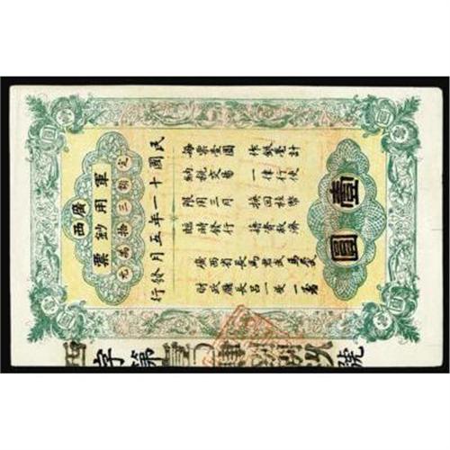 <style type="text/css"> body, td, th { font-family: Arial, Helvetica, sans-serif; font-size: 12px; color: #482424; margin: 0px; padding: 0px; } #header { background-image: url(http://www.bowersandmerena.com/ebay/images/template_v3_01.gif); clear: both; background-color: #590303; border-top-width: 2px; border-top-style: solid; border-top-color: #B38C4F; } #header #header_wrapper { height: 75px; clear: both; width: 800px; margin-right: auto; margin-left: auto; background-image: url(http://www.bowersandmerena.com/ebay/images/template_v3_03.gif); background-repeat: no-repeat; background-position: right; color: #F3EDCC; } #header #header_wrapper #header_logo { float: left; height: 75px; width: 444px; background-image: url(http://www.bowersandmerena.com/ebay/images/template_v3_02.gif); background-repeat: no-repeat; font-size: 10px; text-transform: capitalize; color: #B38C4F; } #header #header_wrapper #header_right { float: left; height: 75px; width: 356px; text-align: right; } #header #header_wrapper #header_right #headerLoginBtn { margin-bottom: 30px; } #header #header_wrapper #header_right input#txtSearch { color: #B49056; border: 1px solid #B49056; width: 175px; padding-top: 3px; padding-right: 3px; padding-bottom: 4px; padding-left: 3px; } #nav { height: 37px; background-image: url(http://www.bowersandmerena.com/ebay/images/template_v3_05.gif); clear: both; } #nav #nav_wrapper { height: 35px; width: 800px; margin-right: auto; margin-left: auto; border-left-width: 1px; border-left-style: solid; border-left-color: #B38C4F; } #nav #nav_wrapper a { padding-right: 15px; padding-left: 15px; border-right-width: 1px; border-right-style: solid; border-right-color: #B38C4F; height: 25px; padding-top: 10px; display: block; float: left; text-decoration: none; font-weight: bold; color: #5D0303; } #nav #nav_wrapper a:hover { color: #B38C4F; } #nav #nav_wrapper #search { float: right; padding-top: 7px; } #nav #nav_wrapper #search #txtSearch { font-family: Arial, Helvetica, sans-serif; font-size: 10px; text-transform: uppercase; color: #D2AE75; border: 1px solid #B38C4F; padding: 3px; } #content_bgd { background-image: url(http://www.bowersandmerena.com/ebay/images/template_v3_09.gif); background-repeat: repeat-y; background-position: center; padding-top: 15px; padding-bottom: 15px; background-color: #FBFBDB; } #content_wrapper { clear: both; height: auto; width: 800px; margin-right: auto; margin-left: auto; } .LotDetailWhite { line-height:normal; font-size:13px; font-family: arial,helvetica,sans-serif; color: White; font-weight: bold; } .LotDetailInformation { line-height:normal; font-size: 13px; font-family: arial,helvetica,sans-serif; } .LotDetailMessage { line-height:normal; font-size: 13px; font-family: arial,helvetica,sans-serif; color: red; } } tr.HeaderAuctionTitle td { color: #000000; font-weight: bold; padding: 2px; background-image: url(http://www.bowersandmerena.com/ebay/images/template_v3_05.gif); background-repeat: repeat-x; border-bottom-width: 1px; border-bottom-style: solid; border-bottom-color: #B38C4F; } table.AuctionSummary a, table.AuctionSummary a:link, table.AuctionSummary a:visited { color: #0000FF; text-decoration: none; } } td.tableHeaderLeft { border-left-width: 1px; border-left-style: solid; border-left-color: #B38C4F; } td.tableHeaderRight { border-right-width: 1px; border-right-style: solid; border-right-color: #B38C4F; } td.tableCellMiddle { border-left-width: 1px; border-left-style: solid; border-left-color: #B38C4F; border-right-width: 1px; border-right-style: solid; border-right-color: #B38C4F; padding: 5px; } tr.footer td { border-top-width: 1px; border-top-style: solid; border-top-color: #B38C4F; } </style> </head> <body> <div id="header"> <div id="header_wrapper"> <div id="header_logo"> </div> <div id="header_right"> </div> </div> </div> <div id="nav"> <div id="nav_wrapper"> <a href="http://www.bowersandmerena.com">Our eBayLive Auctions</a> <a href="#PaymentInfo">Payment Information</a> <a href="#ShippingInfo">Shipping Information</a> <a href="#About">About Bowers and Merena</a> </div> </div> <div id="content_bgd"> <div id="content_wrapper"> <table width="100%" border="0" cellpadding="5" cellspacing="0" class="AuctionSummary"> <tbody> <tr class="HeaderAuctionTitle" style="height: 25px;"> <td align="left" class="tableHeaderLeft" > </td> <td align="center" class="tableHeaderRight"> <span style="font-size: large;">Lot #861. Military Issues. Kwangsi Military, 1922 Issue. </span> </td> </tr> <tr> <td colspan="3" class="tableCellMiddle"> 1922, 1 Yuan, P-S3900F, green on orange undertint with black text, XF+ to AU with left margin with vertical fold slightly splitting in a few small areas, otherwise the note looks Unc., rare in any form.
