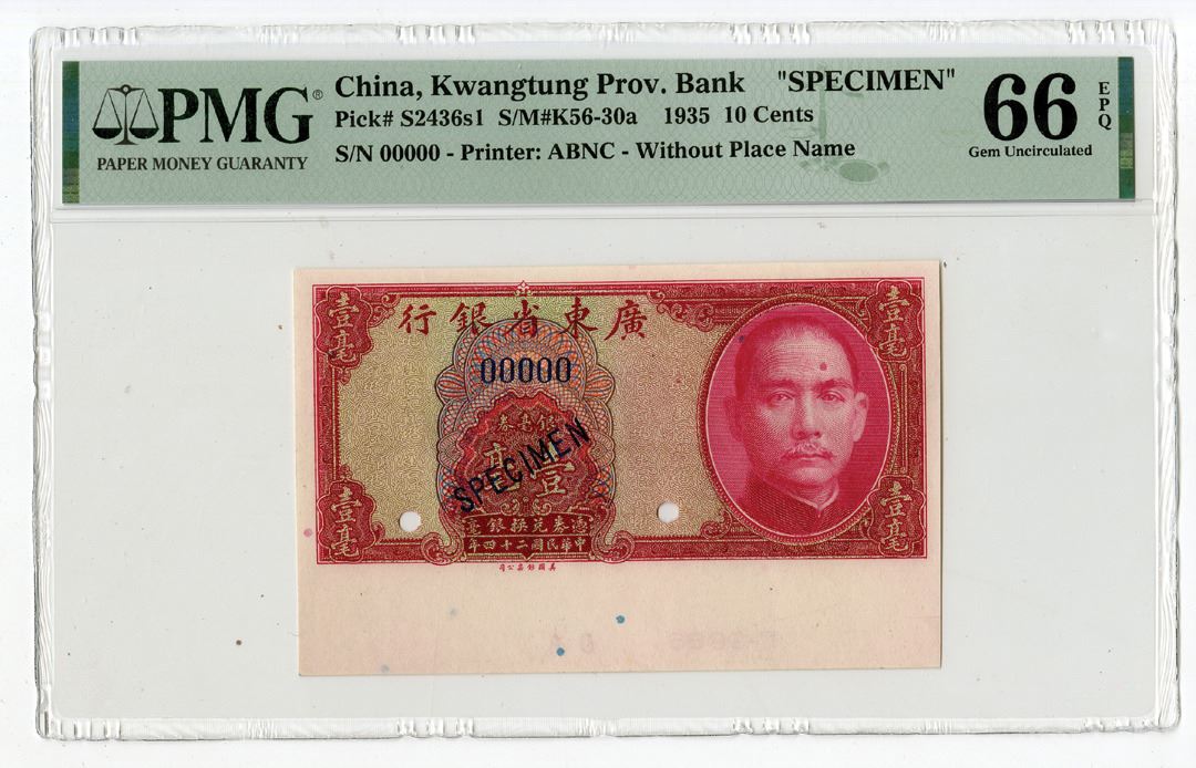 China, 1935. 10 Cents, P-S2436s1 S/M#K56-30a, Specimen Banknote, Red on m/c underprint, SYS at right, Specimen overprints and POCs, S/N 00000, PMG graded Gem Uncirculated 66 EPQ with comment "Selvage Included," ABNC.