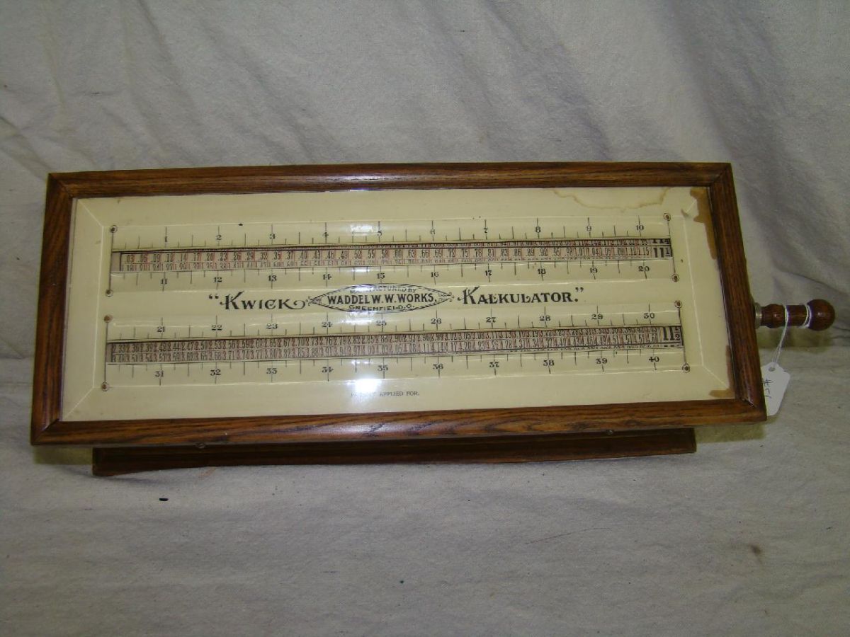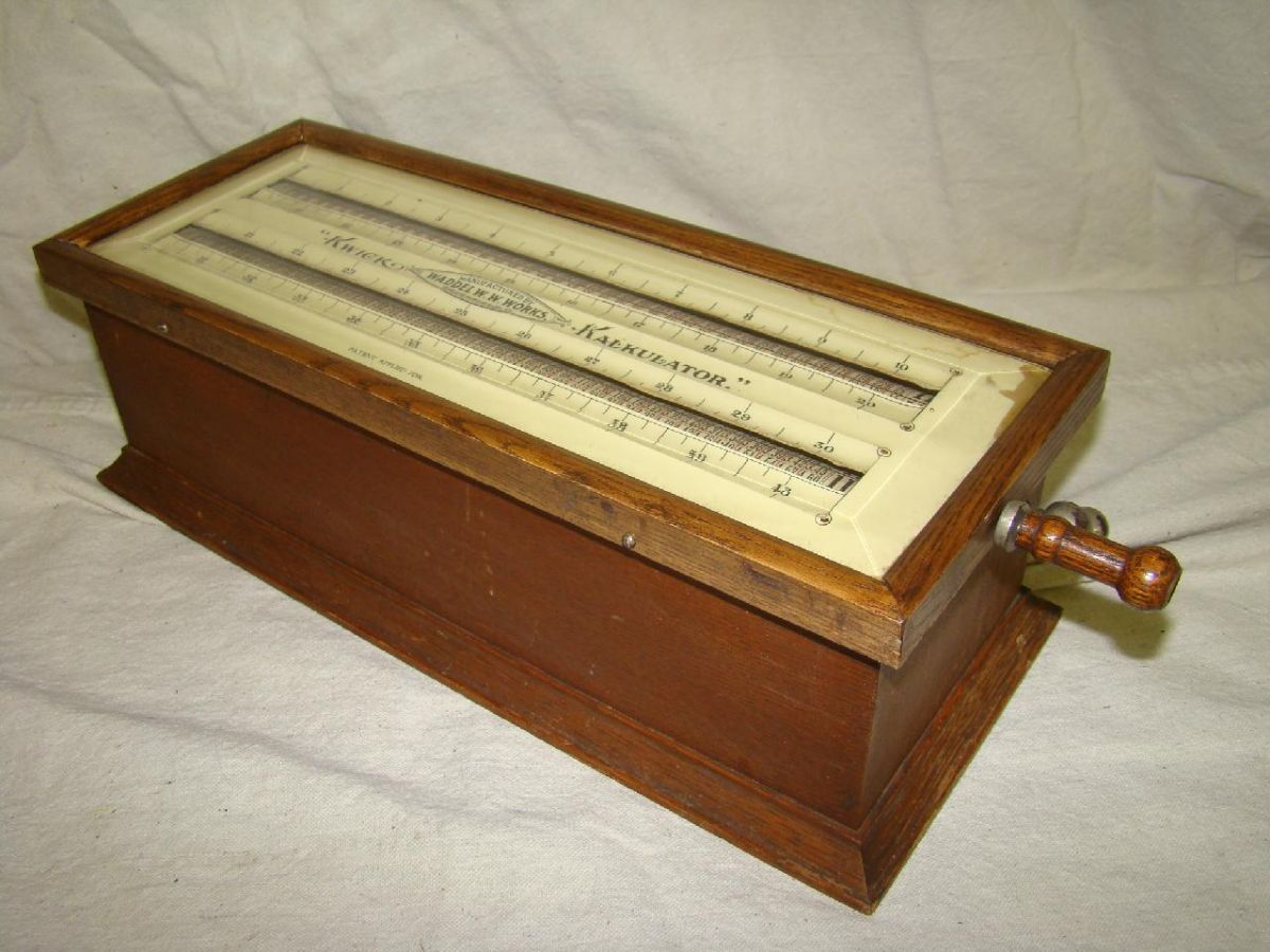 Extremely rare. Manufactured by Waddel W.W. Works Greenfield, Ohio, "Patent applied for". Previously unrecorded calculator with two rollers, large wooden case with glass. Length: 18.5" to tip of handle