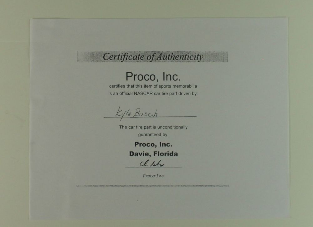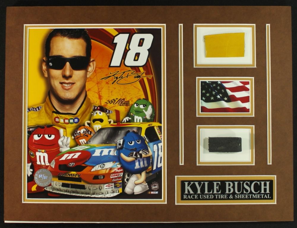 This piece measures 16x12 in size and is highlighted by a piece of race-used sheet metal as well as a 2"x1" section of race-used tire from a Kyle Busch car. Piece comes with a COA for authenticity purposes.