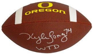 Kyle Long plays offensive guard for the Chicago Bears of the National Football League. He played college football for the University of Oregon. He was considered one of the top offensive guard draft prospects, and was chosen by the Chicago Bears in the first round of the 2013 NFL Draft. Kyle Long is the son of Pro Football Hall of Fame defensive end Howie Long and the brother of St. Louis Rams defensive end Chris Long. Kyle Long has hand signed this Oregon Ducks Brown Logo Football with WTD inscription. Schwartz Sports Hologram and Certificate of Authenticity from Athlon Sports.