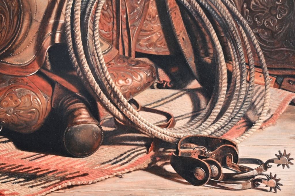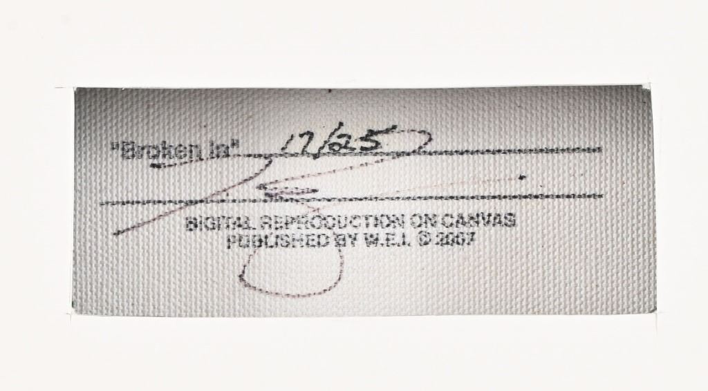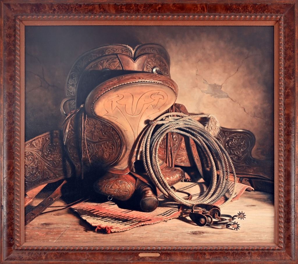 "Broken In' limited edition still life print on canvas, 32" 36. Signed lower left by Texas artist Kyle Polzin, numbered 17/25. Includes COA. Frame measures 38" x 42"