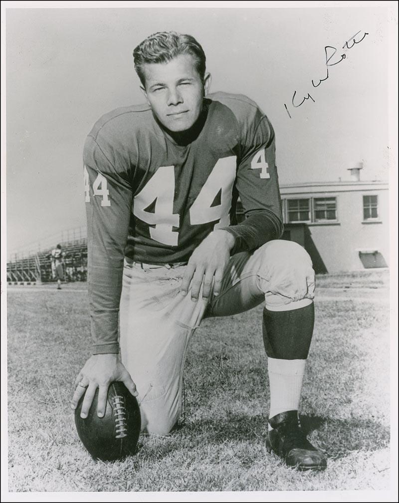 College Football Hall of Famer (1927-2002) who played for SMU, and went on to play for 11 years for the New York Giants. Glossy 8 x 10 photo of Rote taking a knee, signed in black felt tip. In fine condition, with a few small scattered surface creases.