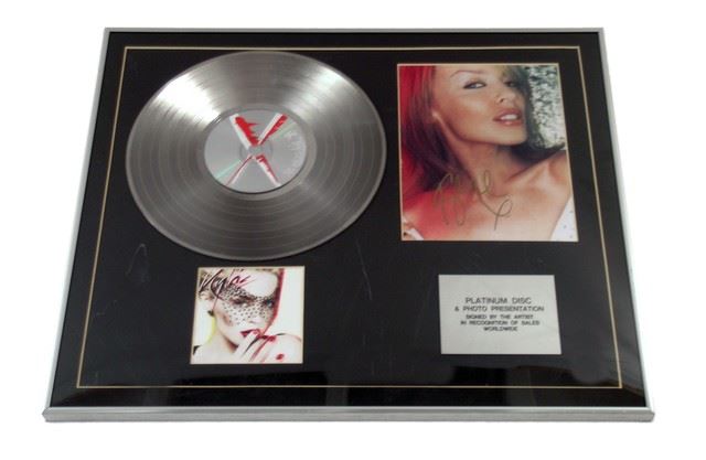 Australian Pop Singer Kylie Minogue simply known as Kylie fully framed and autographed "X" platinum record released in 2007. This record award measures approximately 24 1/2" x 21 1/2".