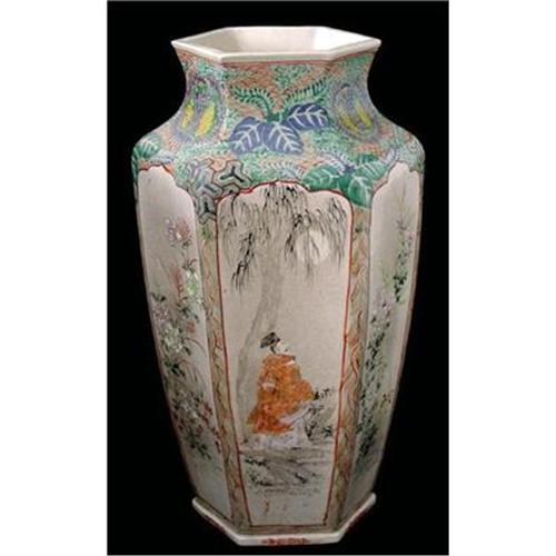 Japanese Kyoto Satsuma hexagonal earthenware vase decorated with alternates panels of human figures in kimonos and raised enamel flowers. It is signed in red Japanese characters on the bottom right of one of the figure panels. The mark's characters include Dai Nippon...Tsukuru (meaning Made in Japan). The characters in between usually indicate the name of the artist. A likely date is from around the end of the 19th century. Marks that includes "Dai Nippon" in Japanese characters date to the Meiji (1868-1912) period, reflecting the greatly increased nationalism of that period. In good used condition with crackle typical of Satsuma, minor restoration and wear to base. Please ask questions, request additional photos and shipping costs before buying.