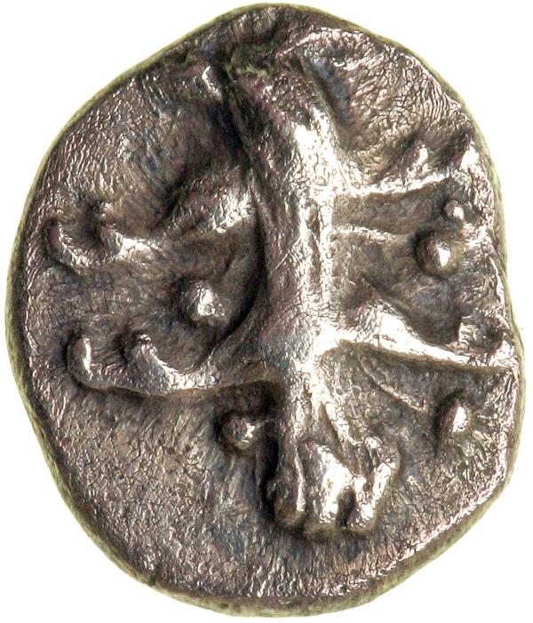 This fractional piece depicts the silphium plant, extinct for nearly 1500 years, which was a form of assafoetida. Silphium was valued nearly above gold, as its medicinal and aphrodisiac properties were in great demand, along with the perfume made from the flowers .