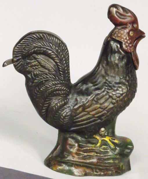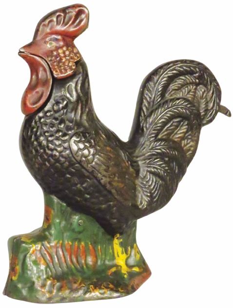 Very Rare Kyser & Rex "Rooster" Cast Iron Mechanical Bank, Ca. 1889. From the Zemenick Collection. Most of the original paint intact. 6 1/4 inches tall.