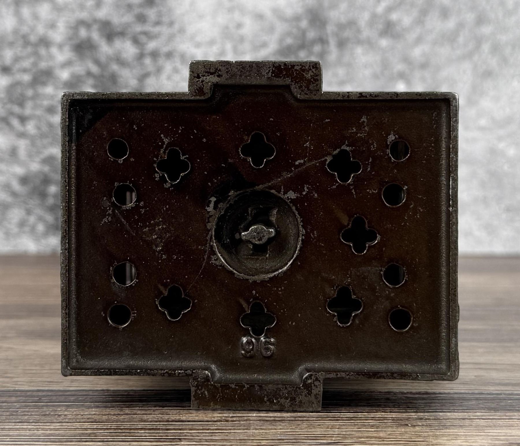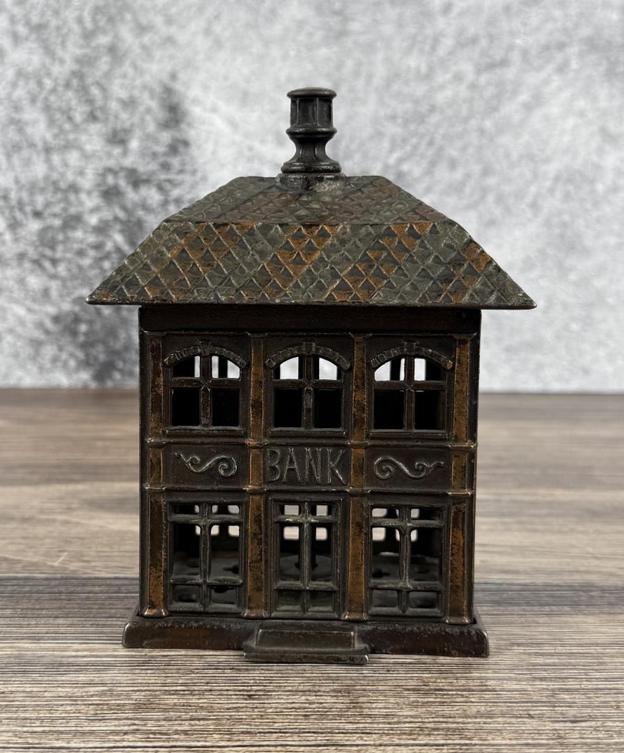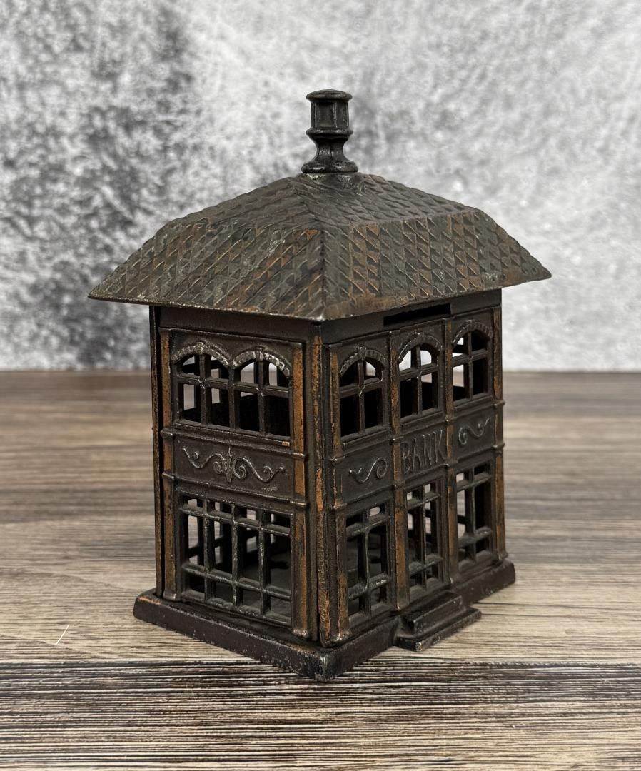 Still Bank Measures 5 3/4" by 4 3/8" by 3 3/8". Base of bank appears to be cracked. Japanned Finish.