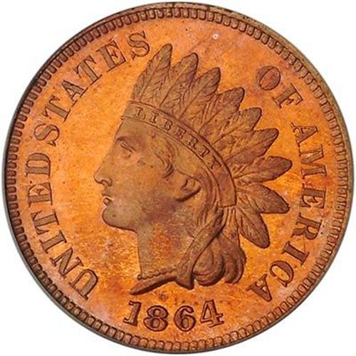 Earlier cents coined under this new act are from the same hub seen on 1860-64 nickel cents, with rounded tip to bust, and no engraver's initial. Later ones (at least 18 obverse dies, probably more) show a narrower, sharper bust point and Longacre's initial L on ribbon: the famous 1864 L cents. These are common in business strike grades (mostly too worn for the L to show), but almost unobtainable in Proof. The L continued on all Proof Indian cents through 1909.