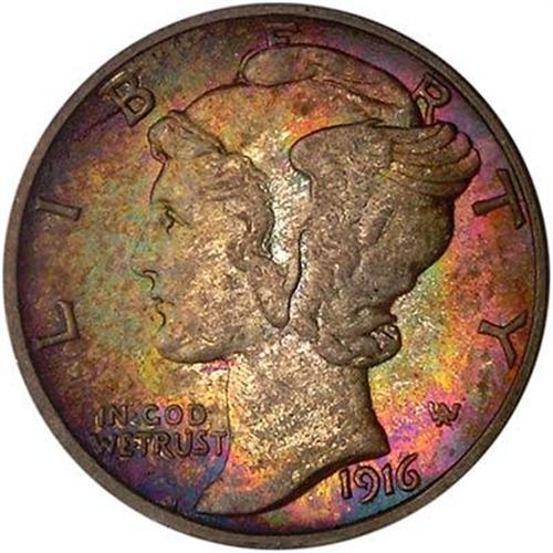 The obverse of Adolph A. Weinman's dime that was introduced in 1916 is dominated by the left-facing profile bust of a young woman whom we know to be the goddess Liberty. She has thickly curled hair framing her face, and these curls are held in check by the close fitting cap she wears. Her cap is somewhat suggestive of a cloche hat, fashionable for women circa 1924-30. Still, the folded over top of the cap reveals that it is not so tight fitting as this. Her head is further adorned with a pair of wings, only one of which is visible. Arranged in a peripheral arc is the legend LIBERTY.