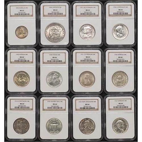 1893 Isabella quarter, MS63 medium toning, 1900 Lafayette dollar, MS63 medium toning over silvery luster, 1921 Alabama 2x2, MS63, 1936 Albany, MS65 satiny with a blush of gold, 1937 Antietam, MS65 light toning, 1936-D Arkansas, MS64 pearl gray color, 1936-S Bay Bridge, MS64 deep russet with gray, 1935 Boone, MS65 satiny, 1936 Bridgeport, MS64, 1925-S California Diamond Jubilee, MS64 original dusky gray color, 1936-D Cincinnati, MS65 flashy and white, 1936 Cleveland, MS64, 1936 Columbia, South Carolina, MS64 tab toning, 1893 Columbian, MS64 light gray patina, 1935 Connecticut, MS65 with blue-white to golden russet, 1936 Delaware, MS65 pearl-gray and gold, 1936 Elgin, MS65 vibrant white, 1935 Hudson, MS64 pale gold, 1936 Gettysburg, MS65 wisps of gold.