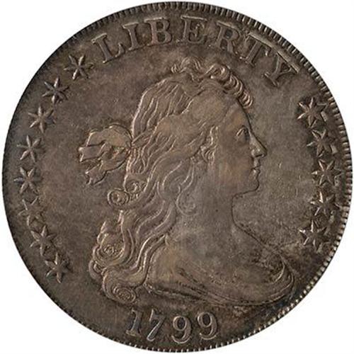 The first of a pair of these scarce star-arrangement varieties, this lovely AU53 boasts original dusky gray with russet toning in various shades of development over each side. The strike is excellent for 1799 with only a little softness at the central hair waves and curls. Scarce.