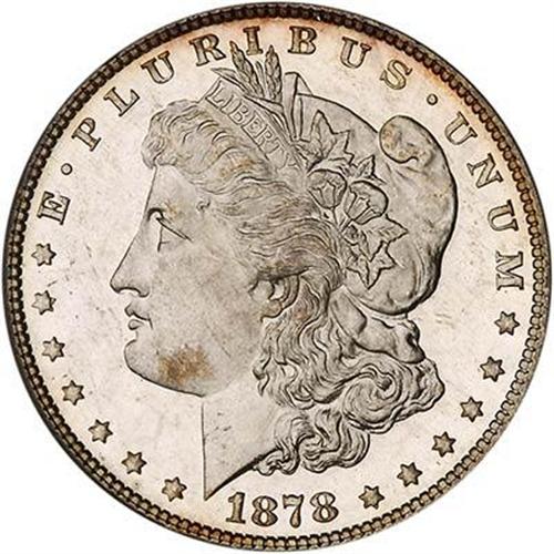 A sparkling coin bursting with luster on the frosted devices while the fields are heavily mirrored, untoned and white in appearance with amber brown at the edge. The surfaces are clear of the usual bagmarks seen in 1878 dollars. Full, bold transfer from die to planchet seen in the hair and strands above Liberty's ear as well as in the complete (and intricate) feather detail of the eagle's breast, wings, and legs.