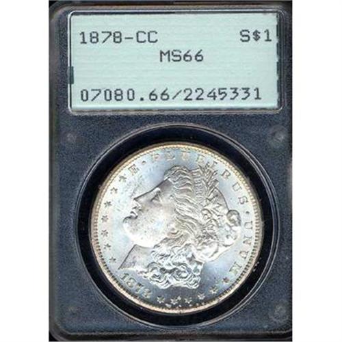 In one of the pre-1989 "first generation" PCGS holders. All minute detail fully evident on this bold 1878-CC. A brilliant, frosty Gem with no visible imperfections other than some scattered contact marks on the facial contour and in the left obverse field.