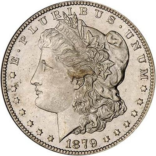 Intense silver color beams from pleasant satin surfaces, with full satin frosted obverse while the reverse is prooflike. Sharp-edged devices and lettering throughout, includes the flat-chested, but full featured eagle breast feathers. The San Francisco Mint, though it had been provided new "Reverse of 1879" dies this year, still had a few leftover reverses from the year before, and used them to strike very limited numbers of Morgan Dollars. Scarce in gem condition.