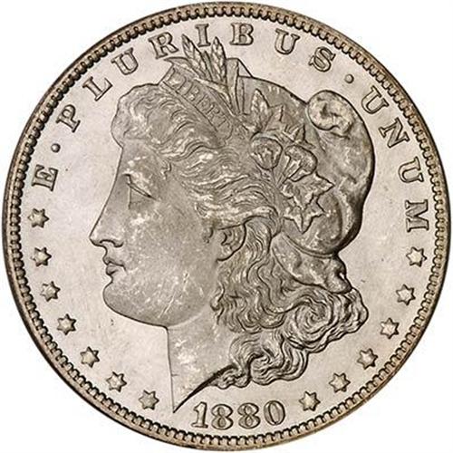 A brilliant obverse and reverse with excellent heavy luster evident. A few abrasions on the cheek and field but considerably finer than average for this traditionally well-bagmarked date. The devices were struck with such force and energy by the dies that all design elements show nicely. Plainly visible "79" beneath the final two digits of the 1880 date. A popular variety.