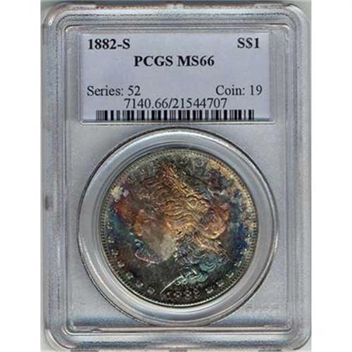 A lustrous example that has rich frosty white luster underneath generous blue and reddish gold obverse toning, the reverse pearl white and gleaming.
