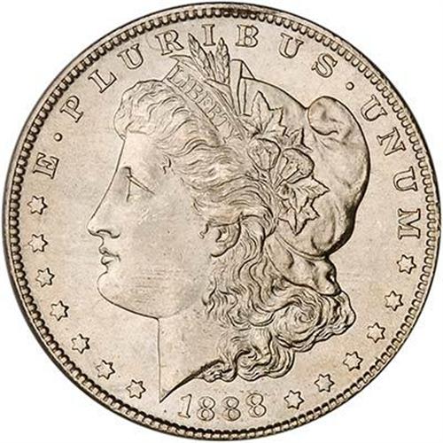 Pleasant satin envelops all surfaces under its silvery radiance, with no heavy toning. Struck with controlled precision throughout, although close inspection of the topmost hair waves (above the ear) show them merging together somewhat. An exemplary 1888-S silver dollar.
