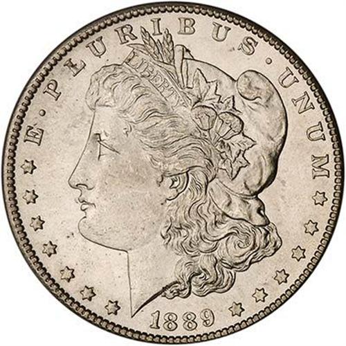 A fully struck example of this always-popular, key issue. The rarest of the Carson City dollars, the acclaimed 1889-CC is also one of the top overall rarities in the Morgan dollar series with 350,000 mintage and mainly seen heavily circulated. As often found on the surviving Mint State, the fields usually have a slightly reflective quality. The striking details are complete on each side, and the only grade-limiting abrasions are a bit of light chatter in the cheek area. Aesthetically appealing, a handsome full strike bristling with near-gem quality mint bloom and without toning.