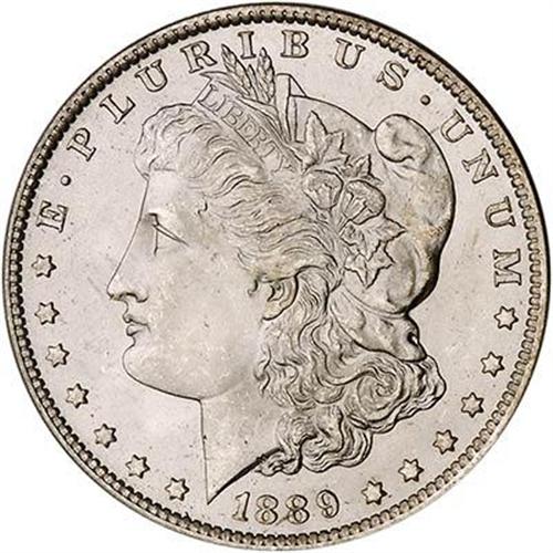 An outrageously handsome example of this important New Orleans date, with stark contrast between the satiny fields and significantly bold devices. Desirable with this meticulous strike that includes almost razor-sharpness in the hair and breast detail (so unlike most 1889-O silver dollars in lower mint state grades). A prize for the collector who is building his own Registry Set of Morgan silver dollars.