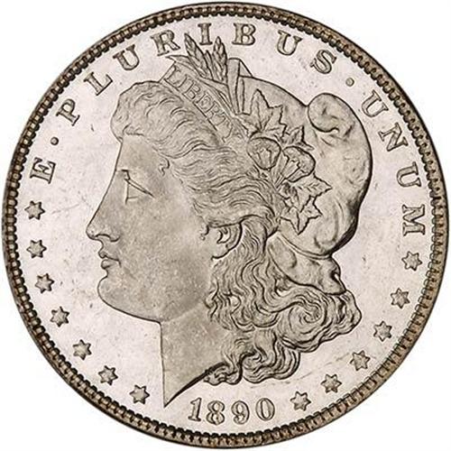 The satin-like luster is almost unimpaired by abrasions of any size. About all we can find with a magnifying glass is a faint line across the cheek. Furthermore, the strike is as keen as a razor on this lovely 1890, a date rarely seen above bagmarked grades of MS62 or MS63.
