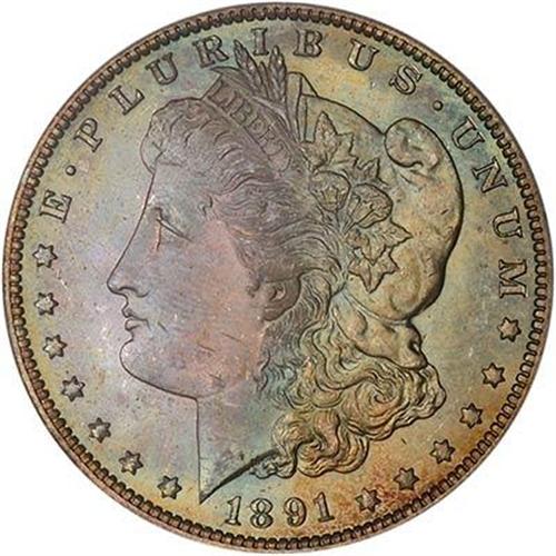 A reasonable strike, with weakness to the central hair above the ear and also, where it lies opposite, the central part of the eagle's breast which lacks feather definition. On the other hand, metal flow enhances the glittering mint frost that covers the surfaces, giving the coin a shimmering, glowing appearance. The original mint brilliance is now overlaid by exquisite multicolor pastels and only interrupted by an occasional tiny bagmark. A worthy candidate for any gem quality set of dollars.
