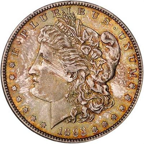 Lovely gold, lemon-yellow, and amber red iridescent patina in and around devices. What a splendid 1893-S dollar in solid AU58 condition: full sharp hair on Liberty, an outstanding eagle, and only the smallest field abrasions from its few short years in circulation. Let it be noted, too, that the rims are immaculate for this very scarce, often problematic issue, with full dentils, absence of marks, etc.