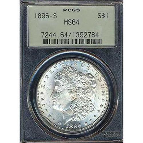 A few light bagmarks on the cheek plus others in the field nearby, there is a short luster graze on Liberty's chin as well, but all in all a frosty, well struck, appealing coin. 1896-S as every diehard fan of Morgan dollars knows, is among the more difficult issues in MS64 condition. Radiant snow white frostiness with pleasing full cartwheel spin.
