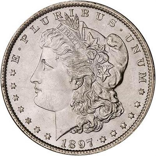 Faithful to every detail due to a full blow by the dies, this lovely MS67 begins a three-coin run of 1897-dated silver dollars for the connoisseur who like eye-catching originality and tone-free magnificence. What is most noticeable when one first examines this coin is its thick, vibrant mint luster -- it swirls around each side unimpeded by obvious abrasions and unsubdued by even a hint of toning. A coin of singular beauty and importance to the collector of the series.