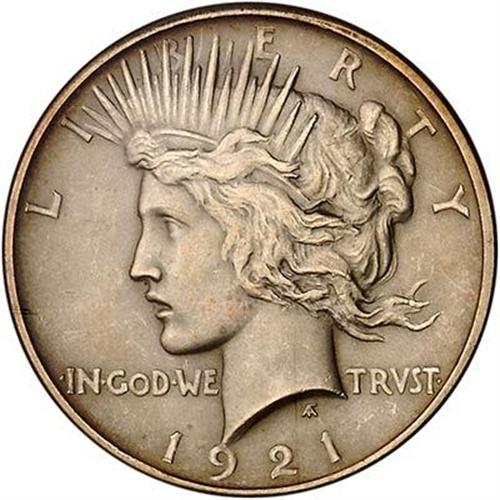 First year of issue and one of the most attractive Matte Finish Proofs ever offered. Light golden brown at the rims, the luster descends to neutral golden gray and dullish silver, partly as a result of the texture chose for the surface. The dies left their rigid impression behind without the least weakness or imprecision, as seen in the hair waves, the eagle's feathers and feet, and all lettering. No doubt this required several blows by the dies on the mint's multi-ton hydraulic press. Normally used to strike Mint Medals, this press was also put to use for special-purpose coins like the present High Relief Proofs of 1921 (and 1922). Anyone who catches a glimpse of this magnificent specimen will come away with a lifetime of awe and reverence for the talent and ingenuity it took the whole team of workers and artists to create such a masterpiece. (NGC holder 1775281-005.)