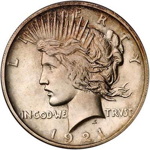 A beautiful example of Anthony De Francisci's new design and the only date available in high relief. George T. Morgan, Mint Engraver at the time and whose own design had been replaced by De Francisci's, lowered the relief of the electroplate model by hammering it with a flat board! The subsequent lower relief was used for the remaining issues of Peace Dollars, 1922 to 1935. Morgan elected to further cut down the relief by lessening the striking pressure on the coin presses, ostensibly to reduce die wear. In a similar fashion to the beautiful 1907 High Relief Double Eagles, De Francisci's beautiful 1921 was thus greatly modified to adapt it to normal coin production. Unfortunately, it is impractical to strike each coin with several blows from the dies to bring up the high relief. It is also not practical to increase striking pressure to the point where the dies wear rapidly and breakage occurs. As with other high relief designs, the mint had to compromise the artist's concept to meet the demands of efficient coin production.