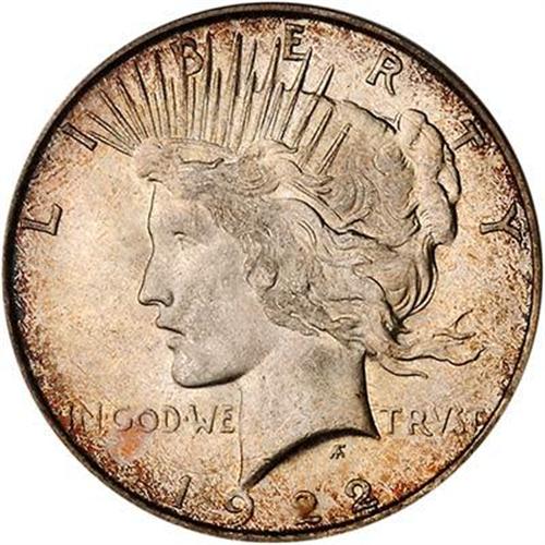 Beautiful cartwheel radiance from surfaces that achieve full satiny perfection. Toned mainly at the rims (warm golden brown) with the reverse covered more by the surface coloration than is the obverse. A wealth of detail seen throughout this well struck 1922-D.