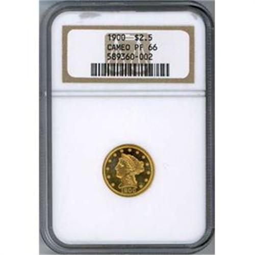 A bright specimen glowing with original mint bloom, the contrast extreme on this razor-edge Proof. What a magnifying glass reveals is splendid watery to "orange-peel" fields supporting devices of pristine beauty, their satin frost unmolested by spots or hairlines or (as happens in extreme cases) that bane of Proof gold pieces, marks. So close to perfection means that it will take a lot of attention during bidding not to be snookered by the other eager buyers in the room who will use every technique in the psychological guides to make you lose attention. The coin comes housed in NGC holder 1827157-001 and is part of a marvelous foursome of 1900-dated proofs we are offering individually so that everyone can participate.