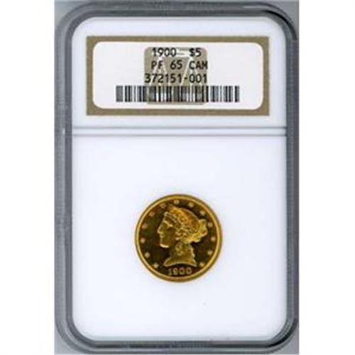 This boldly detailed representative is mostly bright in color with sleek, bright metallic frosted features. Heart-stopping originality in a Proof Liberty $5, the coin exhibits clockwork precision seen in the razor-sharp coronet and hair bun, the eagle's neck, wings and leg feathers. Proofs of this period were each struck on the mint's special hydraulic medal press which imparted a better "squeeze" to the planchet and left the struck-coin with razor-sharpness seen here. It also happens that Proofs were given twice the usual number of blows by the dies, again in an effort to create a perfect impression. The 1900-dated Proofs in the four lots offered here are, one and all, exquisite examples. You shouldn't miss viewing them, even if such prize possessions aren't financially feasible at this time. (Coin is housed in NGC holder 1827157-002.)