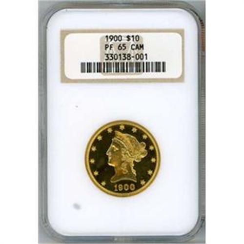 This warmly colored example displays beams of golden metallic detail in virtually all areas with the subtle contrast between frosted devices and "orange-peel" mirrors very distinct. Struck with almost scientific precision on the hair and coronet, the eagle and shield, with all stars, date digits and legends crisply defined. Amazing quality for a Proof gold Eagle! With each denomination in 1900,m mintage declined slightly, for the $10 only 120 Proofs were issued; the $5 almost twice this figure at 230 Proofs. (In those days, as today, collectors could order either individual Proof gold pieces from the Mint or complete four-piece sets, which only a few wealthy collectors could afford.) The coin is in NGC holder 330138-001.