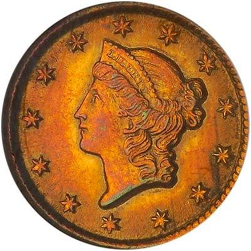 Streaky toning on the obverse with coppery-gold tones over luster. The strike is average for the date, with a few minor weak areas. Scarce in mint state grades.