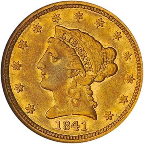No one has a clue where this coin's lovable nickname "Little Princess" arose. It surfaced from out of the blue many years ago and has stuck. No specimen was known outside of the mint cabinet until Edgar Adams publicized the date in 1909, according to Breen. Perhaps "Little Princess" refers to the coin's combination of rarity, petite size, and quiet elegance. Whatever the origin, it bears repeating: we are overjoyed beyond measure at having the honor of presenting an 1841 Quarter Eagle for your bidding enjoyment. This well struck, warm golden colored specimen retains original prooflike surface around the stars and date, the legends and eagle. There is a tiny mark on the rim between stars 2 and 3, a very minor mark in the upper obverse field below star 7, and two tiny identifiable nicks on the reverse below the eagle's lower beak and to the right of F in OF. These are merely references for tracing the whereabouts of this handsome (and famous) 1841 in its future transactions. The NGC holder has serial number 1716037-036.